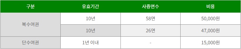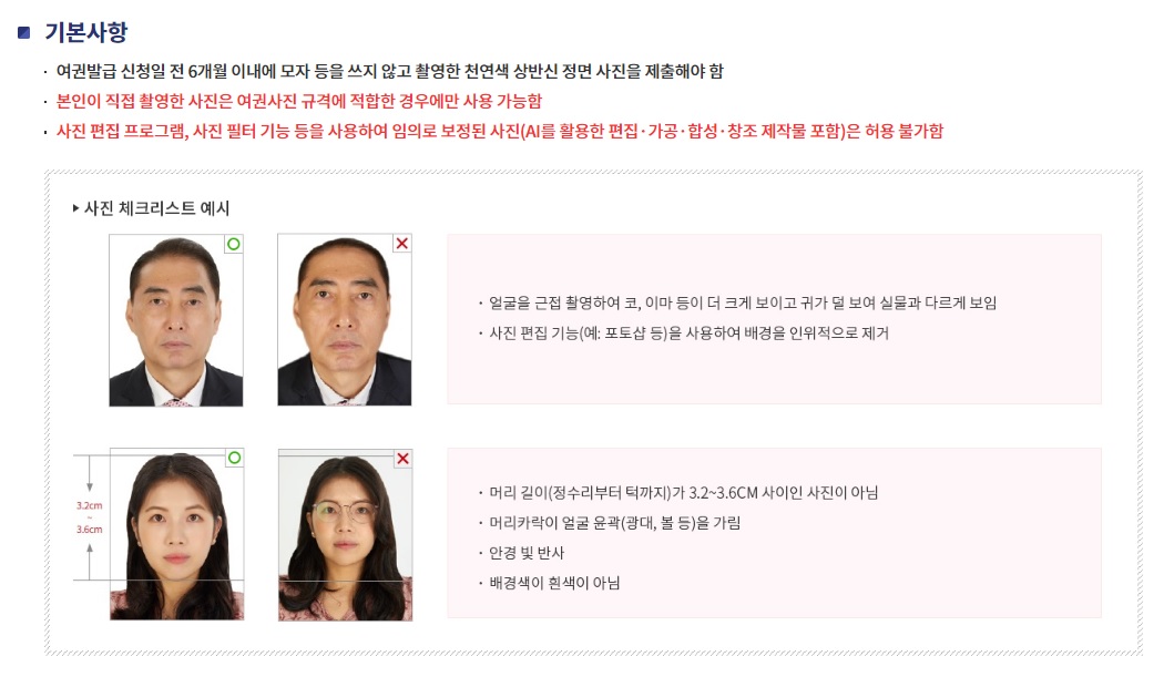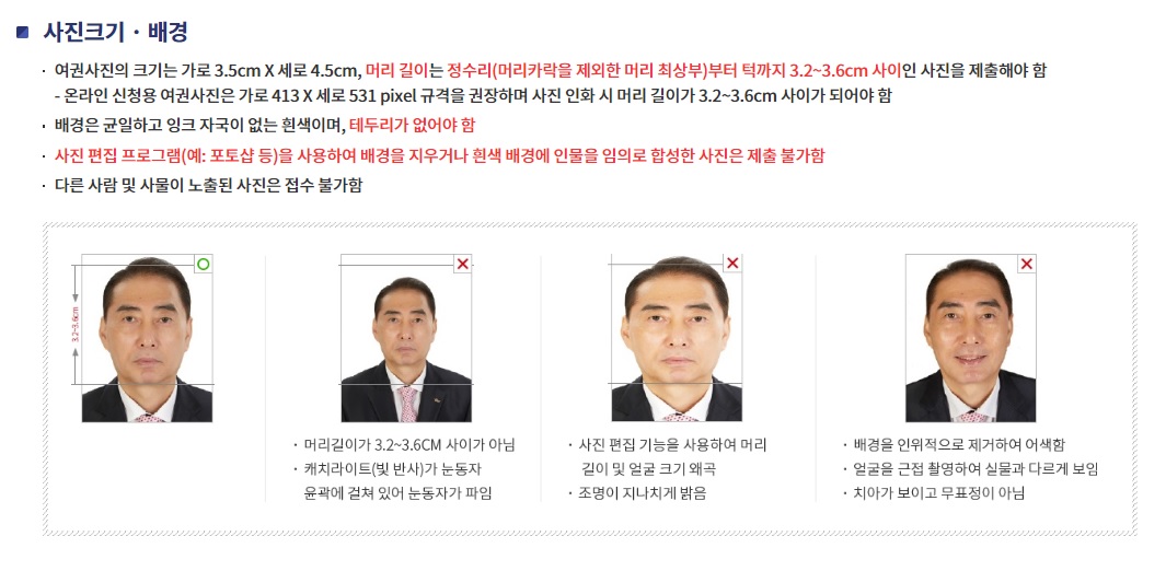 여권용 사진 규격: 여권용 사진은 규격에 맞아야 하며, 자세한 사항은 여권안내 홈페이지에서 확인할 수 있습니다.