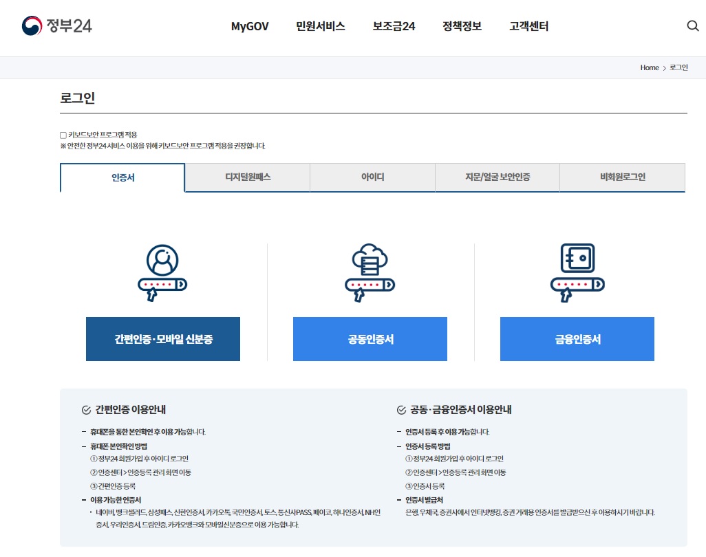 회원가입 후 공인인증서를 이용해 로그인합니다.